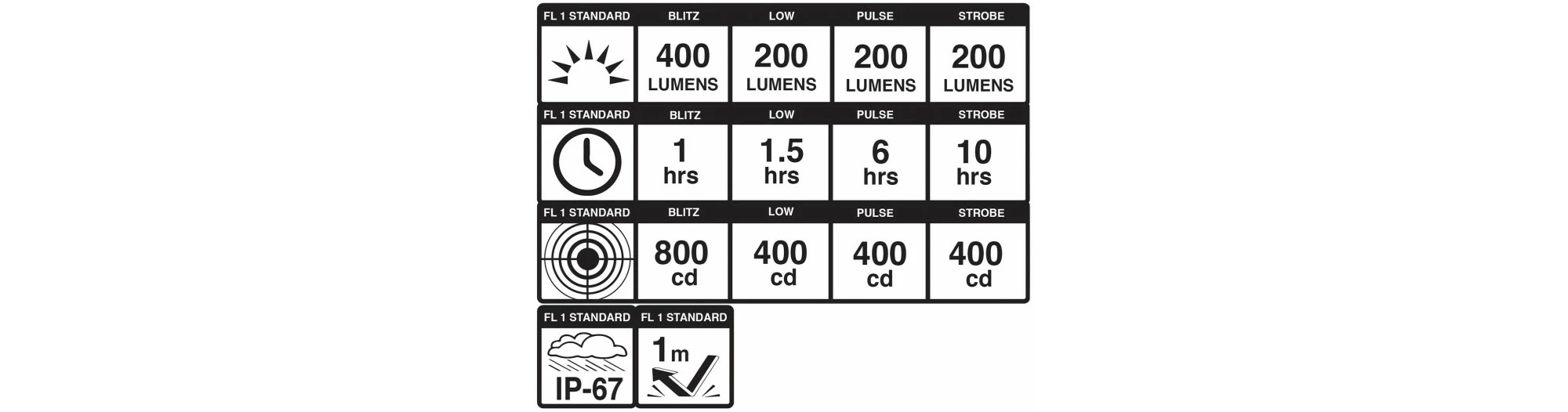 Excellente lumière, excellent prix. Il n’y a pas si longtemps, un phare de 400 lumens à ce prix aurait été une chimère, mais aujourd’hui, le DayBlazer 400 est un rêve devenu réalité ! Avec son mode de conduite diurne BLITZ qui attire l’attention des voitures, sa capacité de submersion IP-67 et sa généreuse visibilité latérale, le DAYBLAZER 400 apporte la lumière là où le conducteur en a le plus besoin. Indicateur de charge LED. Durée d’exécution : FLASH 1 heure (400 lumens), Low 1,5 heures (200 lumens). Durée de l’impulsion/stroboscope : 6 heures (200 lumens)/10 heures (200 lumens).