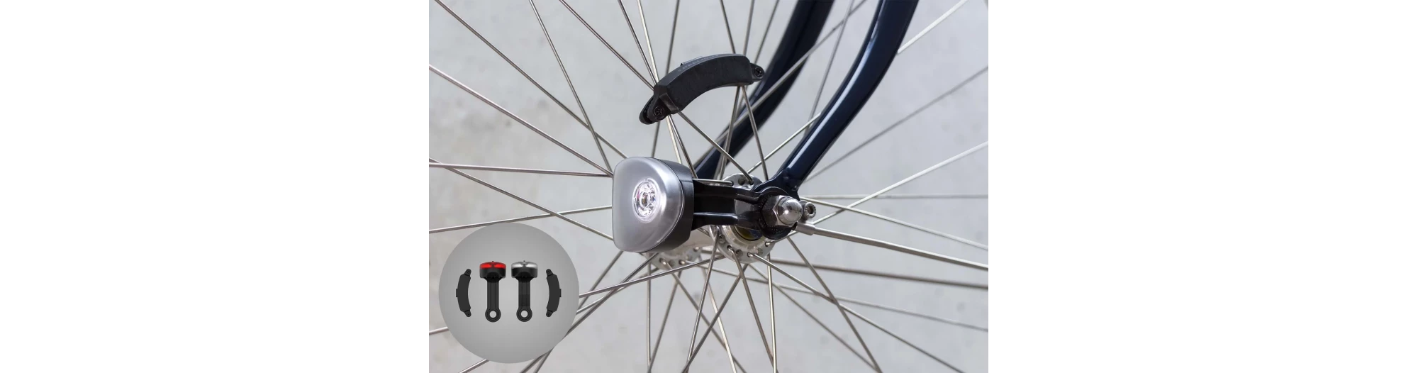 Le montage des feux de vélo est rapide et facile. Le feu de vélo est monté sur le moyeu et est conçu pour tous les vélos équipés de freins en V ou de freins cantilever. L’intensité lumineuse correspond à celle d’une lampe à piles ordinaire avec des piles neuves. Le feu de vélo produit sa propre puissance d’induction respectueuse de l’environnement au moyen d’une bobine dans la dynamo et d’aimants sur les rayons du vélo – sans aucune utilisation de piles.