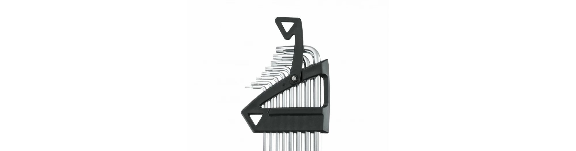 Avec le jeu de clés Torx® Topeak DuoHex, tu as les clés Torx® les plus courantes à portée de main. Le jeu se compose de 8 clés en L de grande qualité en acier au chrome-vanadium. Le crochet dépliable intégré au support permet d’accrocher l’ensemble sur un panneau porte-outils.